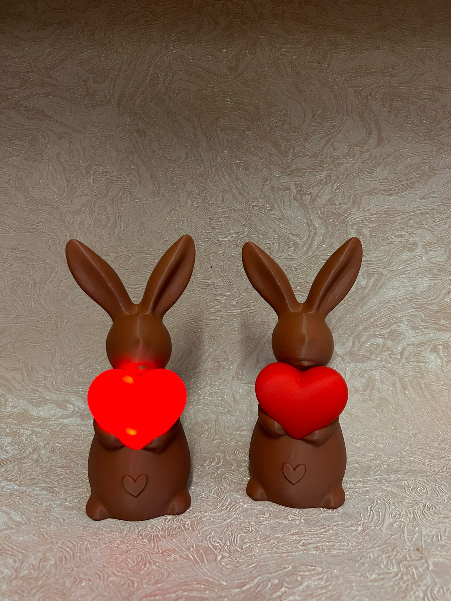 Der Hase wird aus hochwertigem Filament im 3D-Druckverfahren hergestellt und ist etwa 20 cm hoch. Durch das optionale Licht im Herz entsteht ein besonders warmes und stimmungsvolles Leuchten – perfekt für Fensterbank, Kommode oder Ostertisch.