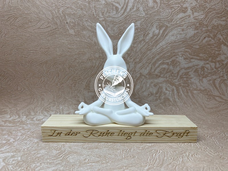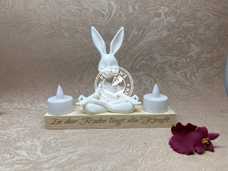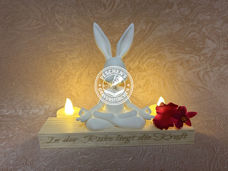 Ein sanfter Hase aus hochwertigem PLA-Filament thront auf einem liebevoll gravierten Holzpodest und lädt zum Innehalten ein. Mit deinem persönlichen Wunschtext graviert, wird er zum einzigartigen Symbol für Achtsamkeit, Frieden und innere Stärke – perfekt für Yoga-Ecken, Wohnzimmer oder als Geschenk mit Herz.