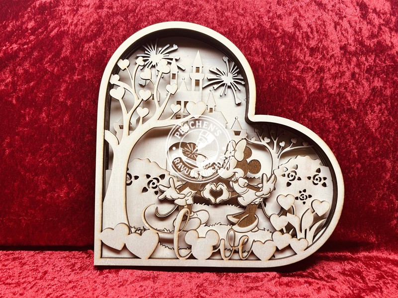 Dieses kunstvoll gestaltete Herz mit Mickey-Mouse-Motiv ist ein echtes Highlight für Disney-Fans und Liebhaber besonderer Holzkunst. Das Design besteht aus 7 fein aufeinander abgestimmten Schichten, die mit höchster Präzision im Lasercutter gefertigt wurden. Dadurch entsteht ein faszinierender 3D-Effekt, der Tiefe und Lebendigkeit verleiht.
