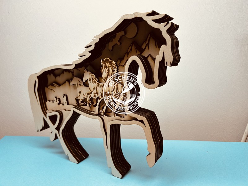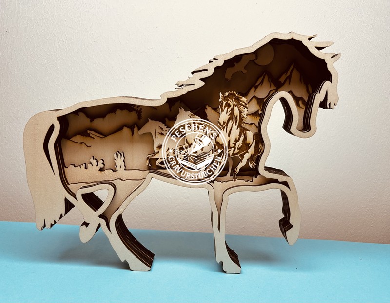 Die verschiedenen Ebenen verleihen dem Motiv eine eindrucksvolle Tiefe und Lebendigkeit, wodurch das Pferd nahezu zum Leben erwacht. Das natürliche Schichtholz sorgt für einen warmen, authentischen Charakter – perfekt als Dekoration für PferdeliebhaberGeschenkidee oder stilvolles Element in jedem Wohnraum.