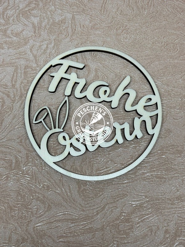 Der Kranz wird aus hochwertigem Holz gefertigt und mit präzisem Laserschnitt veredelt – so entsteht ein natürliches, warmes Design mit feinen Details. In der Mitte prangt der Schriftzug „Frohe Ostern“
